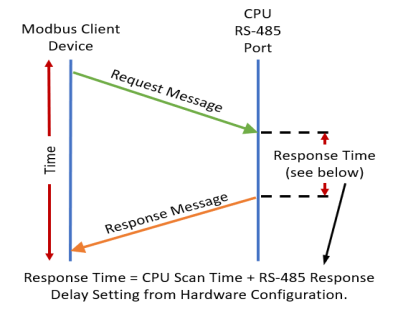 q. Response/Request Delay (RS-485 Only): Used when the CPU is a Modbus RTU Server or Client on the RS-485 Port. The total Response Time can be up to the Total CPU Scan Time + the Value specified in this field. When using 2-wire RS-485 communications, sometimes Echoes can occur since both devices use the same differential signal pair to send and receive.