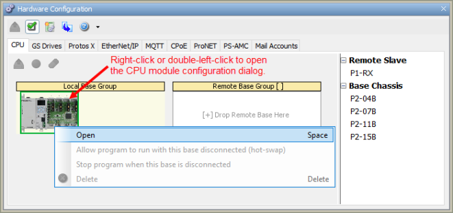 The P2-622 CPU is configured using the setup tools found in the Hardware Configuration window. First select the Local Base Group from the Hardware Configuration window by double left-clicking the Local Base Group or by right-clicking the Local Base Group and selecting Open from the drop down menu as seen below.