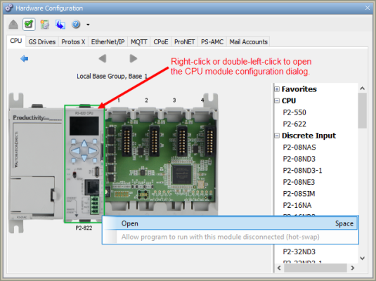 Then select the P2-622 by double-clicking the CPU or by right-clicking the CPU and selecting Open from the drop-down list. This will display the P2-622 configuration window.