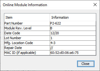 a. Module Info: Click on this button to open a window that displays information about the specific Module. A sample of the Online Module Information is shown below.