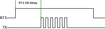 n. RTS On Delay Time (RS-232 Only): The amount of Time between when the RTS Signal is turned ON and the data transmission begins. The diagram below illustrates this. This setting may be needed when using media converters (RS-232 to RS-485 converters) and/or radio modems. A delay may be needed after the assertion of the RTS Signal and when the data transmission begins for processing time in the device.